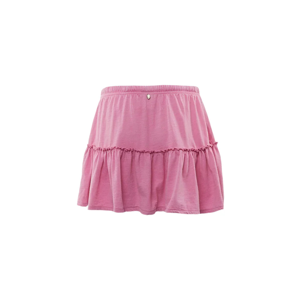 The skirt features an elastic waist, with the elastic attached to the body to prevent rolling, and a self fabric drawcord. The skirt has a second tier with gathering, and the hem is finished with a double turn and single row of stitching.