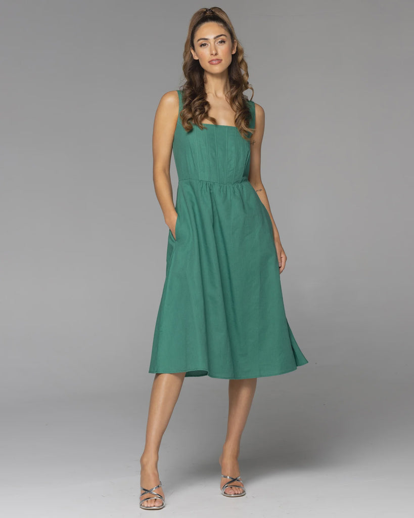 The fitted corset bodice, meticulously crafted with boning, defines your silhouette with grace and style. A shirred back panel ensures a comfortable and flattering fit. The clean skirt shaping flows effortlessly to a midi length, exuding timeless charm. Practical side pockets add a touch of functionality to this exquisite piece.
