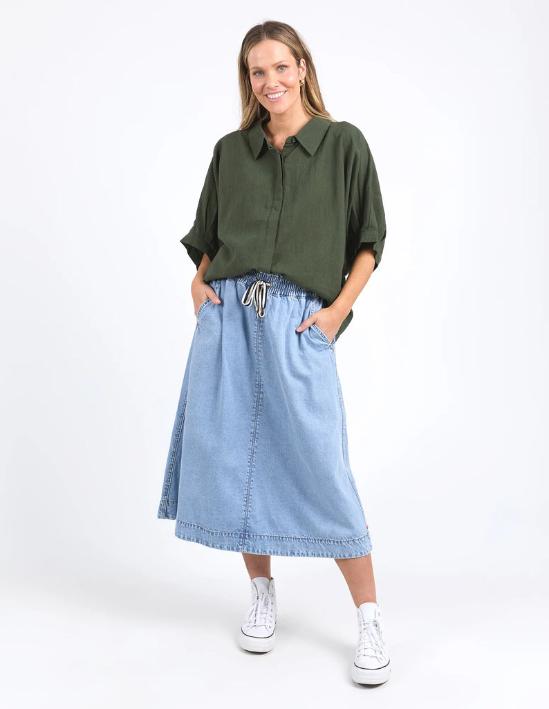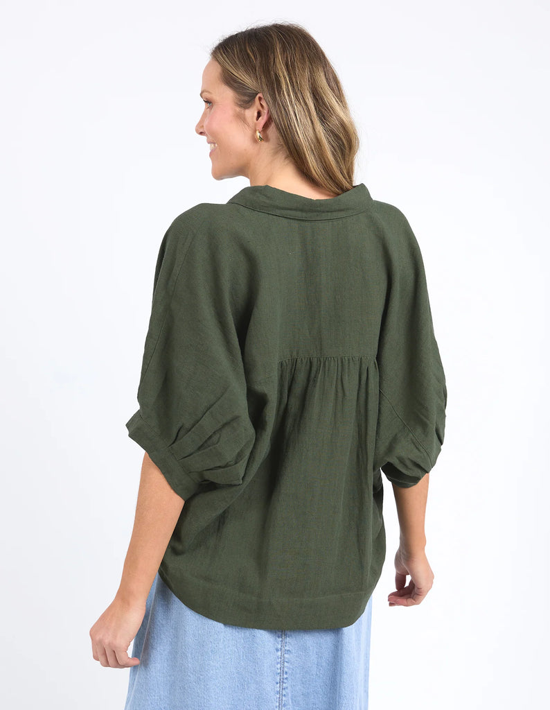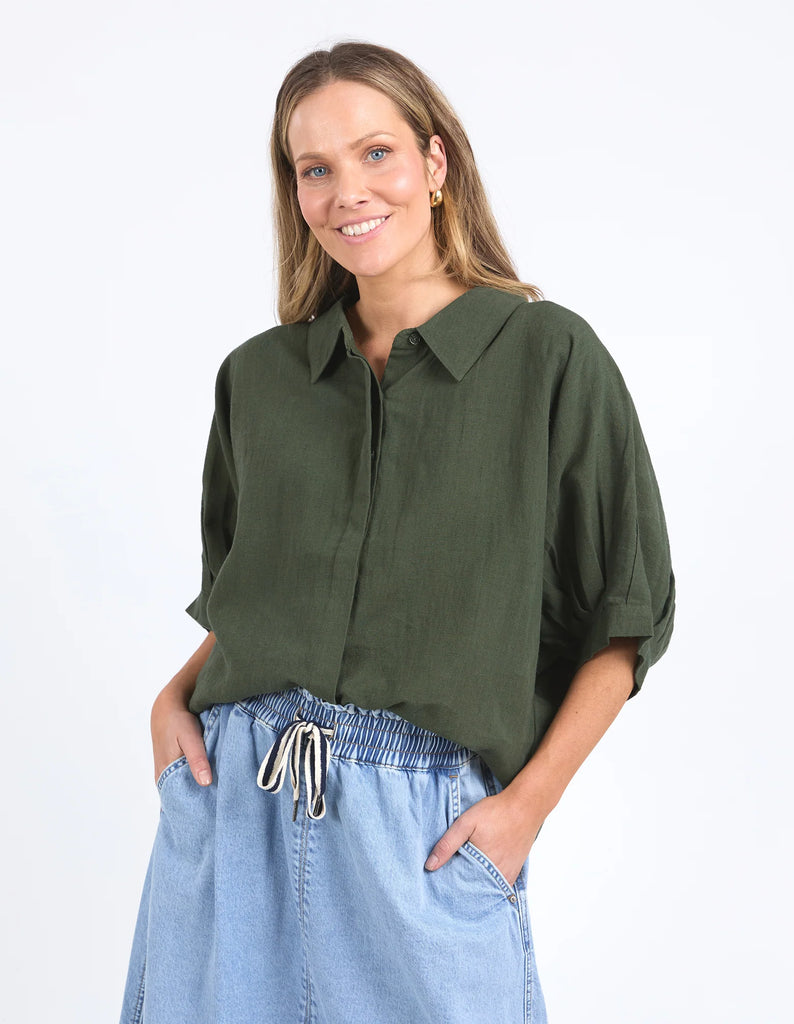 A traditional shirt with a playful twist! Complete with a collar and full button front, the Jemima Shirt is slightly oversized for a unique look when tucked or paired with your favorite bottoms. Plus, the lovely 3/4 cuffed and slightly ballooned sleeve adds a touch of charm. Oversized fit Linen viscose blend Cuff sleeve Linen Viscose Model is wearing a size 10