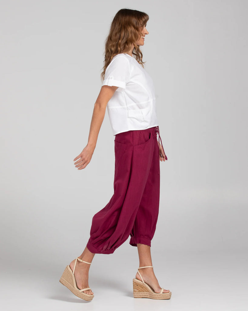 Slip into the Guru Pant and embrace effortless style. This magenta marvel features a snug waistband that keeps everything in place, while the billowing three-quarter leg lets you move freely through your day. Crafted from pure cotton with a stretchy waistband and drawstring closure, it's got two front and back pockets for all your essentials. The relaxed, balloon-cut silhouette pairs beautifully with everything in your wardrobe. Pro tip: If you're caught between sizes, go up for that extra cosy vibe.