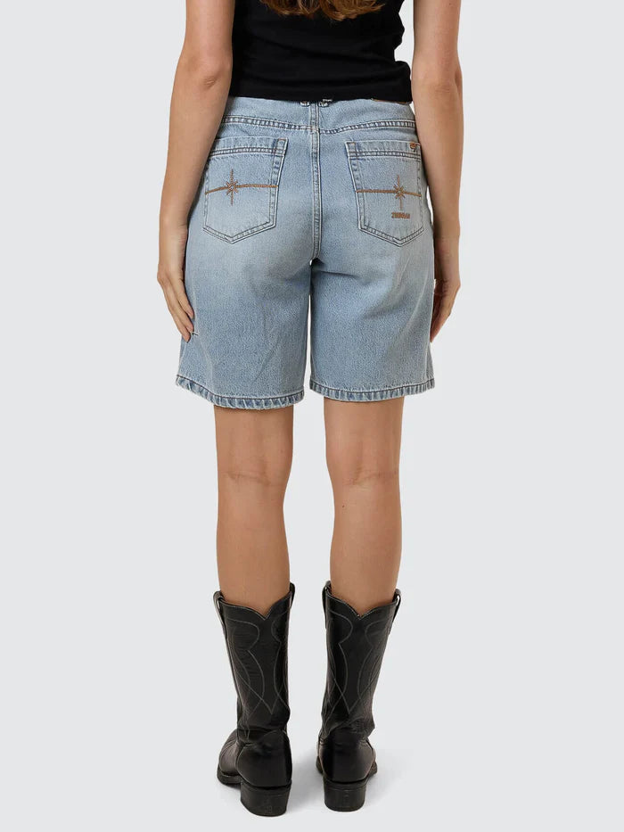 Relaxed with a throwback twist, the Dopamine Reagan Slouch Short in Dusk brings 90s attitude to your warm-weather rotation. Made from heavyweight cotton denim, these casual cotton shorts feature a mid-rise waist, wide leg opening, and an all-new faded wash for an effortlessly worn-in feel. Made to be lived in, dressed up or down, and loved, this is a bold choice from our Thrills shorts women's range, perfect with 90s and 2000s fashion tees for an effortless, retro look.