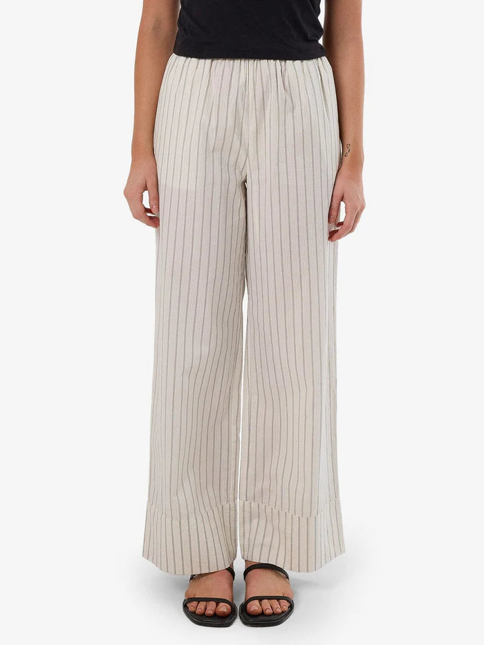 Embrace laid-back vibes with the Unwind Stripe Pant in Off White. These breezy wide-leg beauties feature a textured cotton seersucker weave that keeps things light and airy. The elastic waistband means zero fuss, while the generous, relaxed fit pairs beautifully with everything from fitted tanks to oversized vintage tees. Whether you're lounging or hitting the streets, these striped stunners deliver effortless cool without trying too hard.